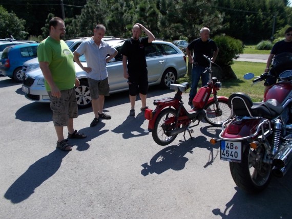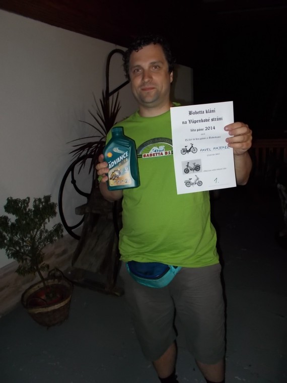 Sobota, hlavní den srazu. Dorazil pan Hlavatý a je právem středem pozornosti, jako výrobce náhradních dílů k Babettám a taky o tom ledacos ví. To je velice důležitý moment srazu. Vyřeší se tak mnoho problémů okolo ND a servisování těchto kultovních strojů. Doufám že napřesrok dorazí opět. Jenda j.r. odjel před polednem, pokračuje dál, do SR, kde má nějaký slez s přáteli. Jinak Vápenky pokračují tradičně Tedy se především žere. Cyklisti se letos nekonají, Javorina Tour bude až o týden později. Škoda. Já sice moc nežeru, vedro je hodně přes 30 st. Je to na mne dost a nesu to poměrně těžce. Tak dieta, ale to nevadí. Dorazil Erik ze SR, tentokráte na Jawce, tuším 350. Opečovává ji s láskou, jako všechny motocykly co vlastní. Dorazil zbytek Babetta Crew, který byl na vyjížďce. Jsou hezky opálení, hic dělá svoje. Říkají, že to bylo náročný. Povedlo se také navázat po počáteční nesmělosti kontakt s druhou částí „účastníků zájezdu“, kteří obývali chatku č. 2. Mezi Babettami, které dojely na sraz, jsou dvě krásné modifikace Babetta Military Vehicle, radost pohledět. Taktéž i verze Babetty vyvážená Do USA. To je vidno na obrázcích, pokud se mi je povede nějak vydolovat z nového aparátu, což pilně trénuji. Odpoledne následuje I. ročník slavného závodu Babettové klání pod Vápenovou strání 2014.