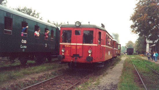 Legendární M131 "Hurvínek" není třeba více představovat. Patřil ke koloritu této dráhy po mnoho let. Zde ho vidíme jako zvláštní vlak, který se křižuje v Postupicích se druhým zvláštním vlakem při oslavách 100 let dráhy v roce 1995. Jedna perlička: Málokdo ví, že vozy této řady mají mechanickou, plně synchronizovanou převodovku podle německého patentu firmy Mylius getribe Berlin z roku 1936 a že tento typ vedl v padesátých létech rychlíky na trati Plzeň - Cheb/!!/